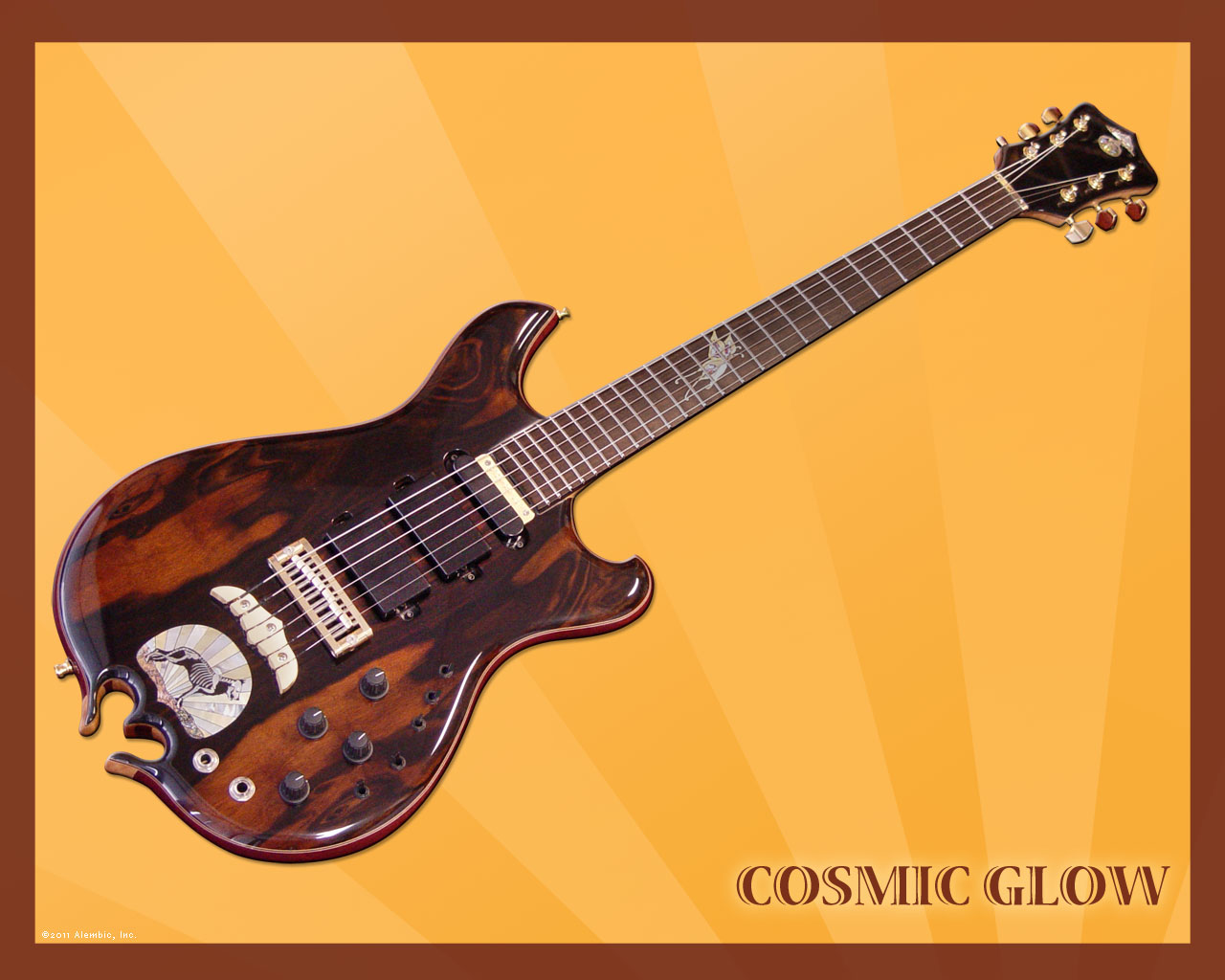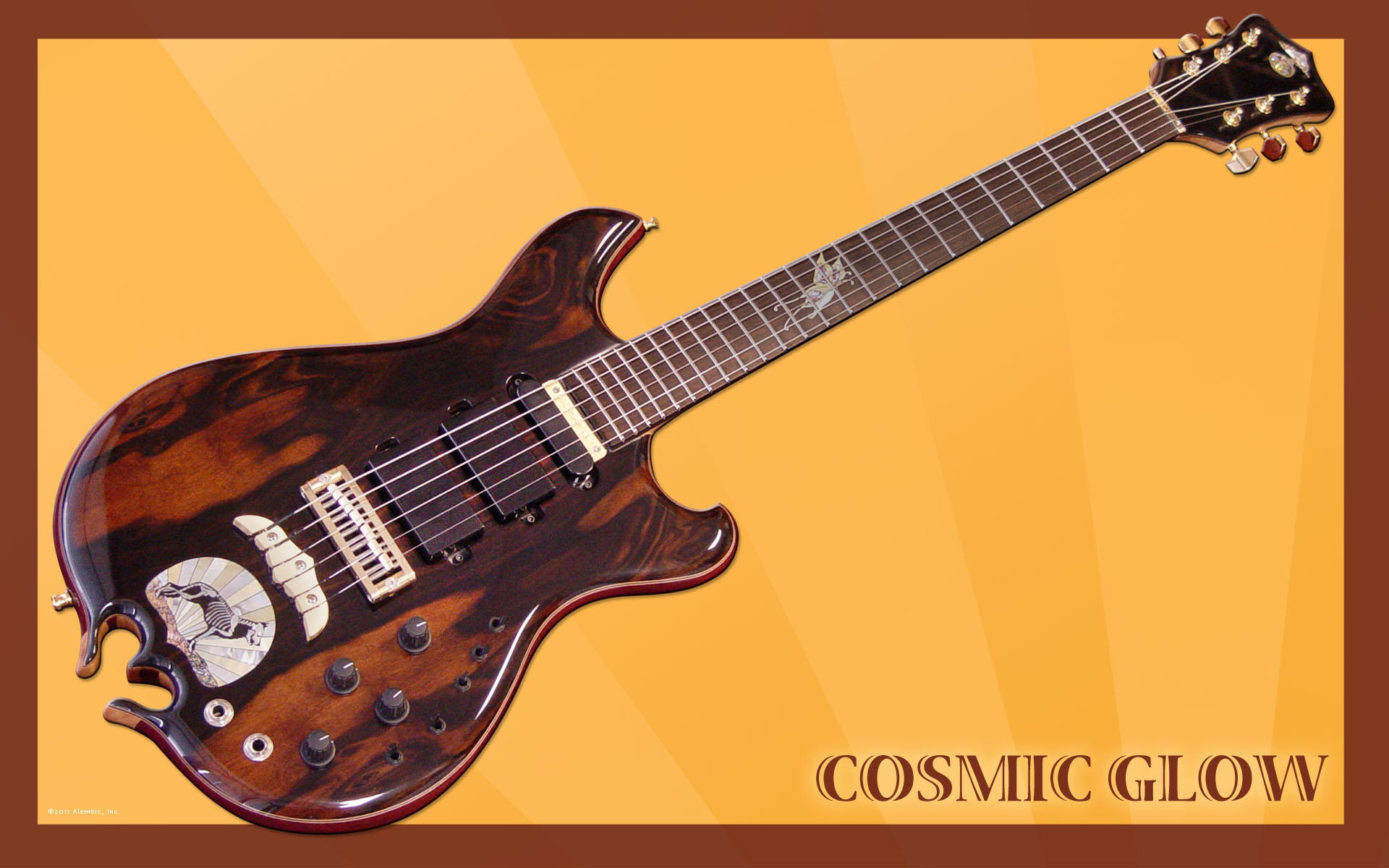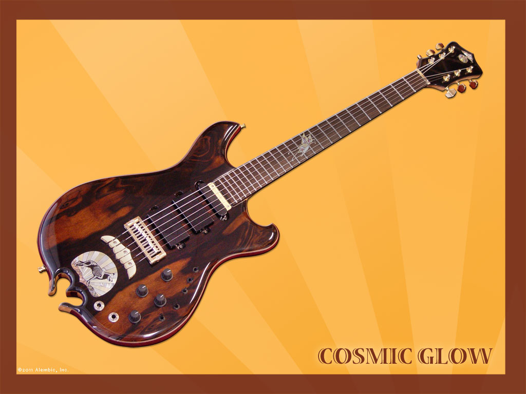 - "Cosmo’s spirit" fingerboard inlay in black and gold mother of pearl, abalone, red acrylic and sterling silver