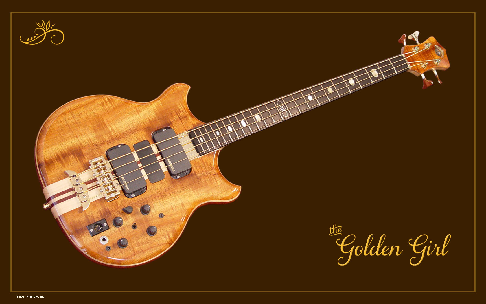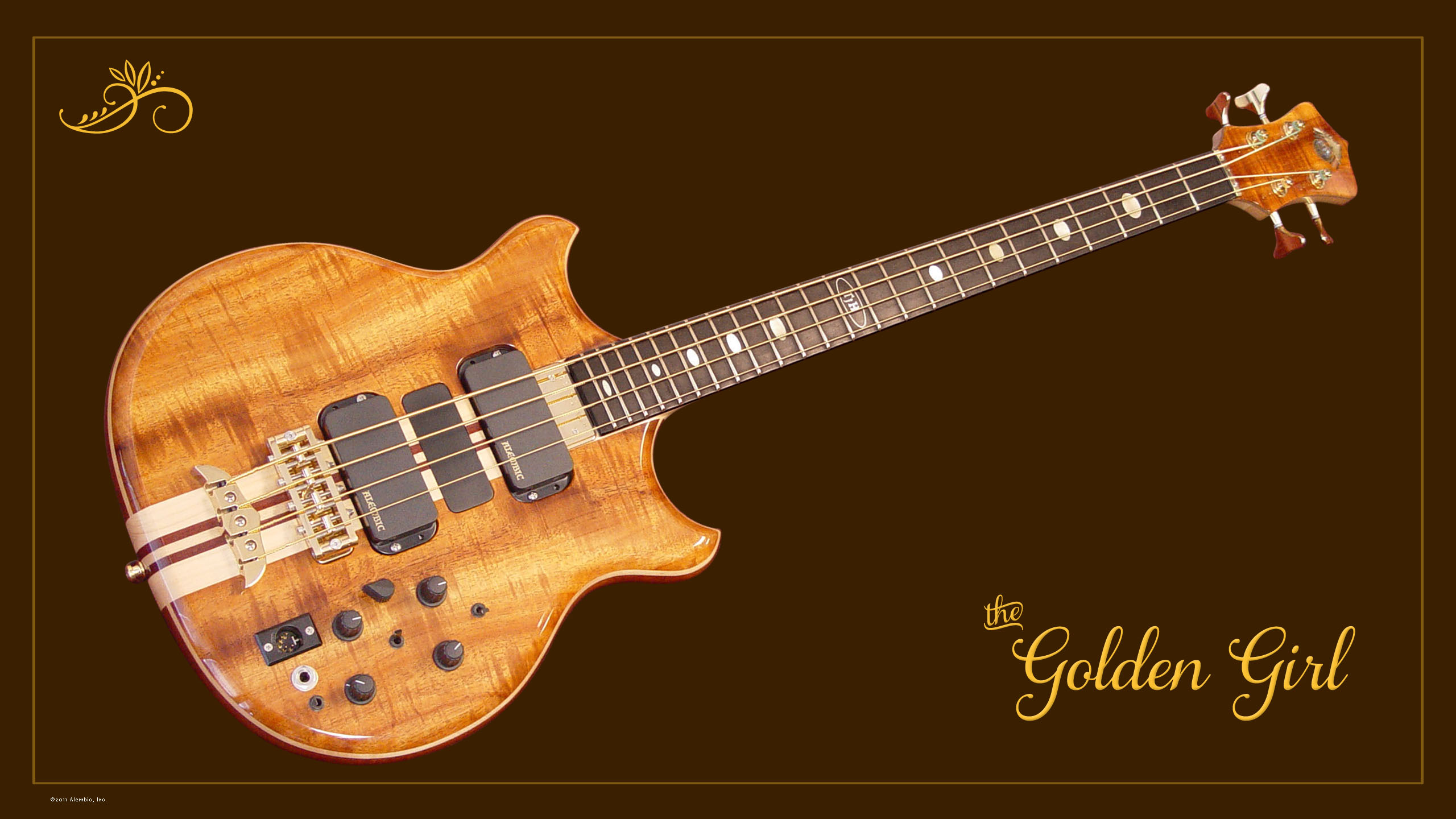Just another touch of gold with the golden mother of pearl cloud in the inlaid Alembic logo. Paired with the polished bronze logo and gorgeous abalone, it’s like a jewel on Golden Girl’s crown peghead.
