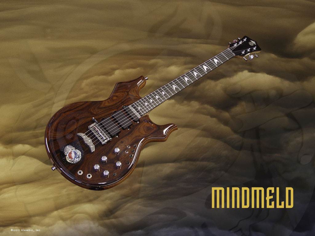 Classic Crown peghead with an Ebony front veneer tops off Mindmeld. Sometimes the Ebony is nearly black, but this time there are some lighter streaks in the wood. The logo is sterling silver with abalone and mother of pearl all inlaid below the finish.