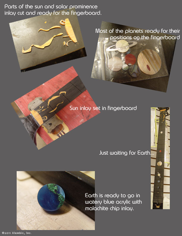 We strived to get major features of the planets represented, including axial tilts, to make the inlays more than just dots of various colors. Mercury has one white mother of pearl hemisphere and one black. Venus is cloaked in a sea of pink mother of pearl. Earth combines watery blue acrylic and malachite. For Mars we used recon coral with a polar ice cap of mother of pearl. Jupiter’s bands are formed from bronze mother of pearl with its Great Red Spot in recon coral. Saturn is white and golden mother of pearl. Uranus and Neptune are abalone. While Pluto has officially been reclassified a dwarf planet, it’s earned a place in our hearts as the largest known member of the Kupier-Edgeworth Belt. In a likely unique appearance on a guitar inlay, the Oort cloud is represented by a scattering of tiny sterling silver dots.