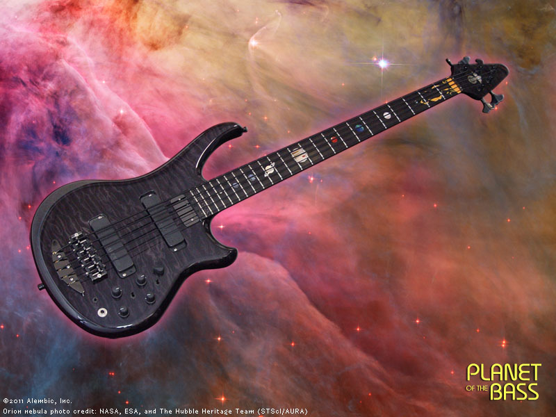 Eric’s wonder of the solar system was the inspiration for his second Alembic bass. He already had a Mark King Signature Deluxe bass with LEDs. But, as with the rest of us, getting a little older meant that this rather heavy bass (at just over 13 pounds) was taking a toll on his back come the end of the gig. He needed his next instrument to have all the Alembic sound he loved, but easier on his back.