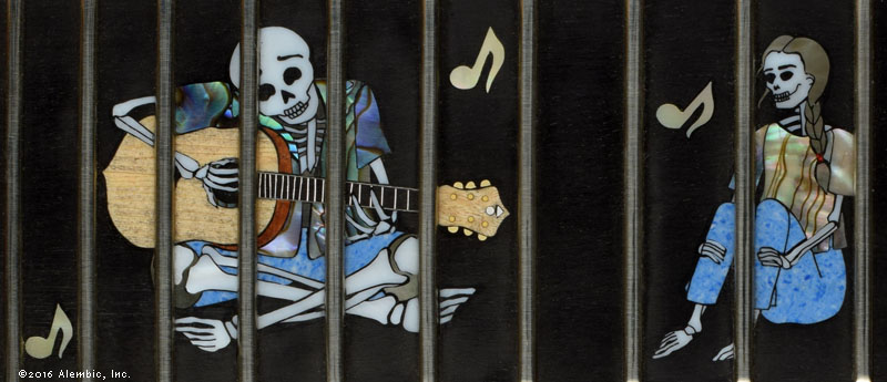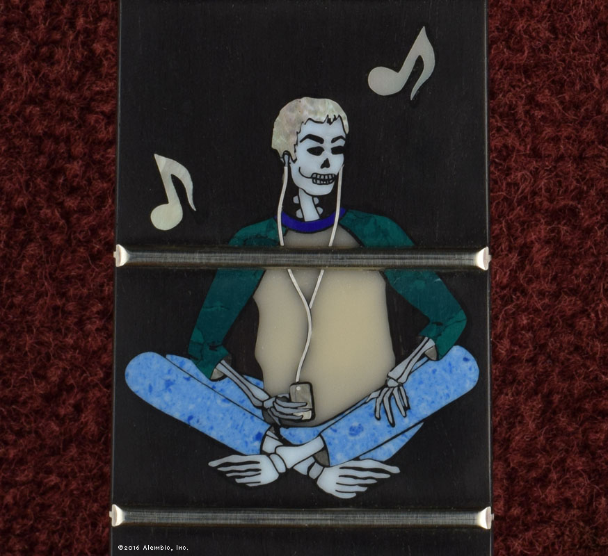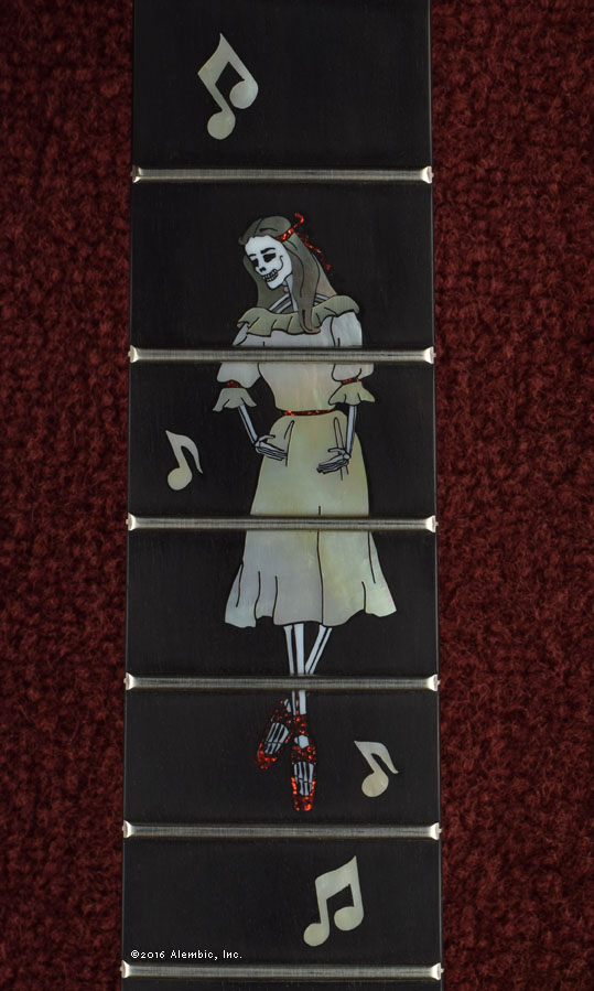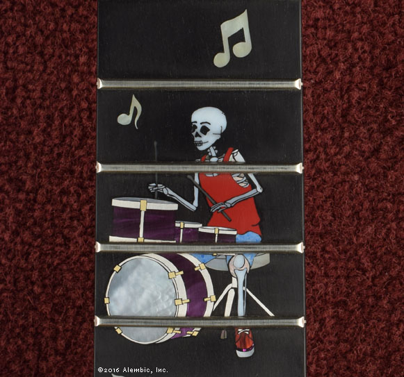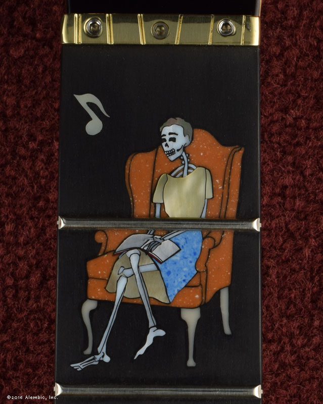 The fingerboard is a collection of six main skeleton inlays, each to represent the family members. Not only are each person’s interests represented, but the inlays needed to resemble each person. This was no small task! Of course we take some creative liberties with things like eyebrows to help, but the most important thing is the shape of the skull. All of the bones are mother of pearl, and keep in mind that each individual tooth is a separate inlay, and everything is hand-cut, right here at Alembic.