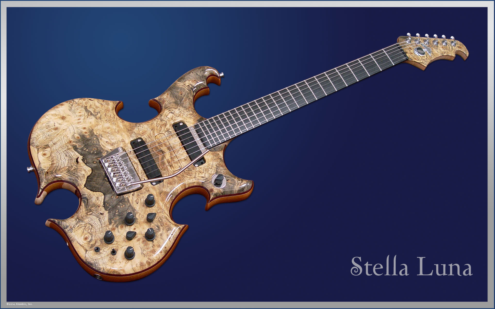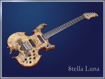 Stella Luna started with John perusing the wood bank online and finding this beautiful Buckeye Burl slab large enough to bookmatch to center (where we cover the neck with the top laminate). John was very fond of the Triple Omega body shape we made for John Paul Jones of Led Zeppelin. The version John selected is scaled properly for guitar and includes a pistol grip detail on the upper horn.