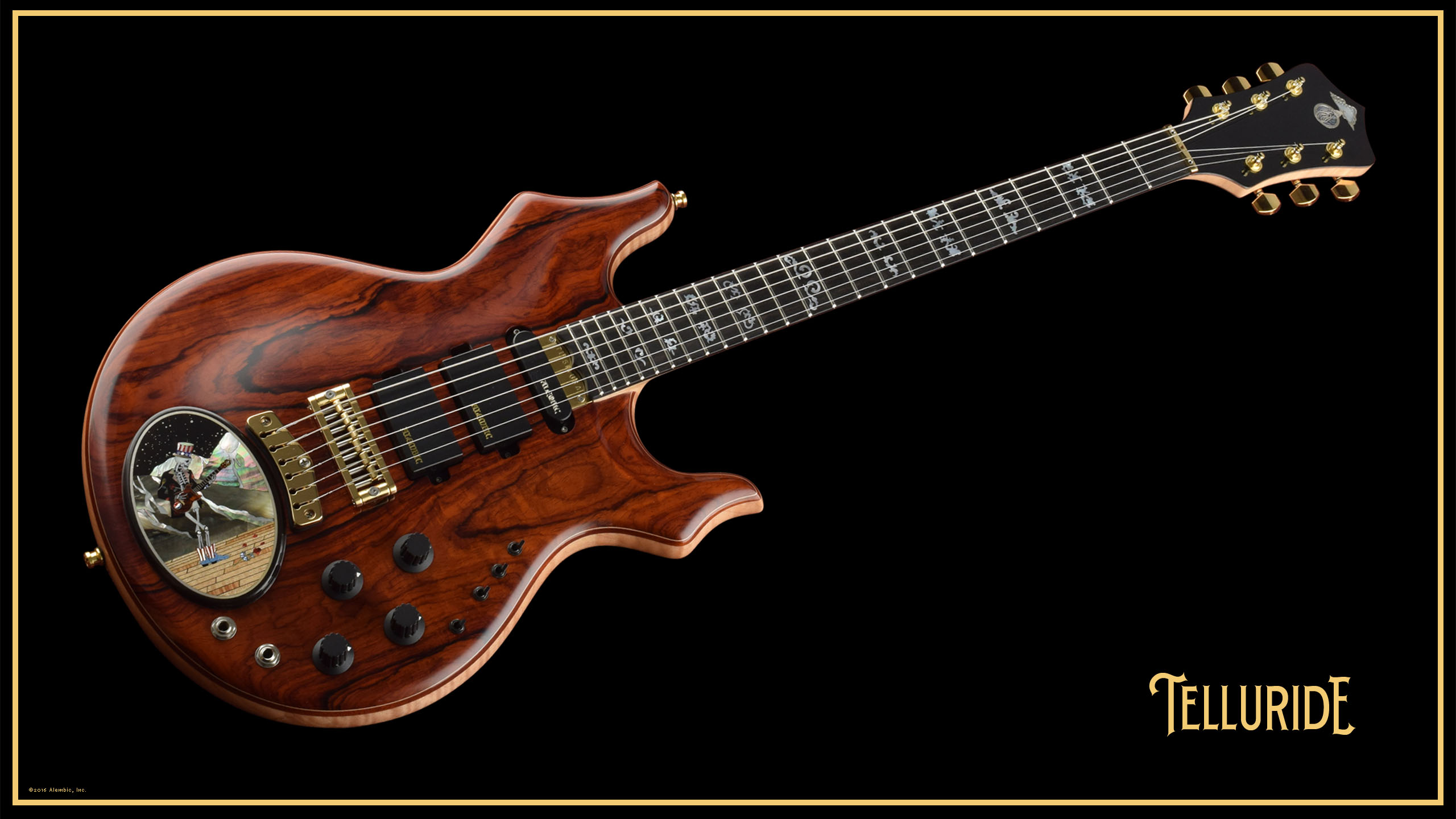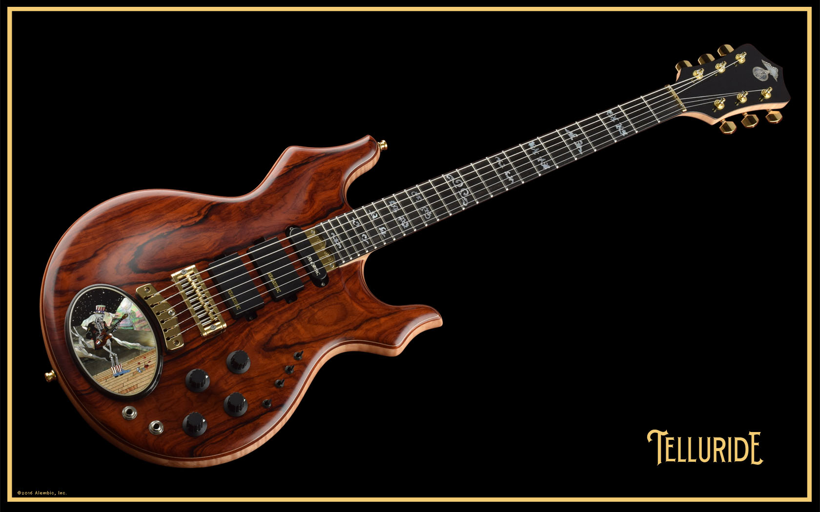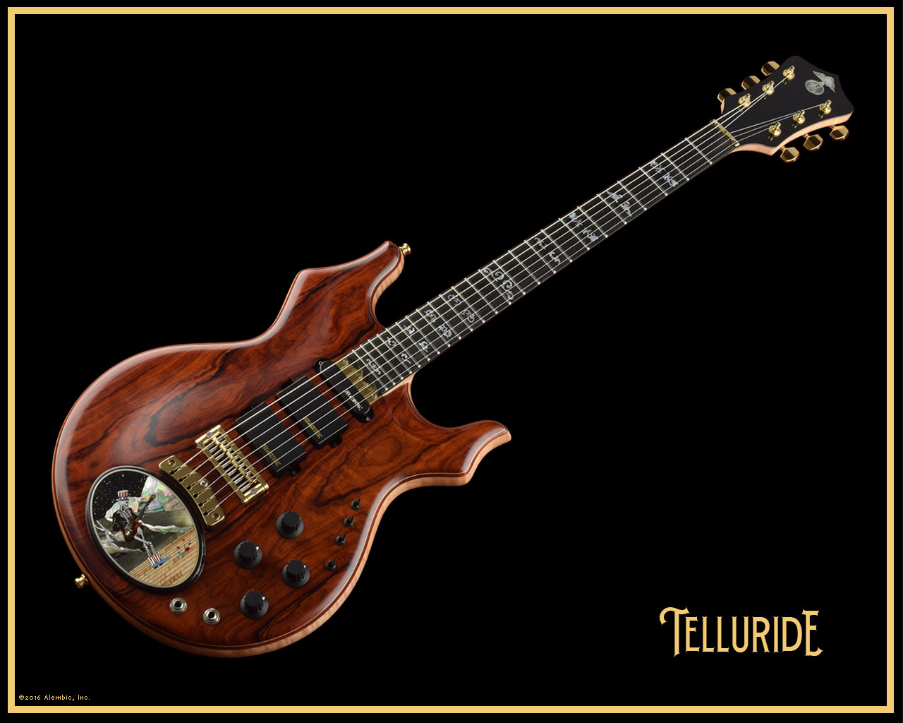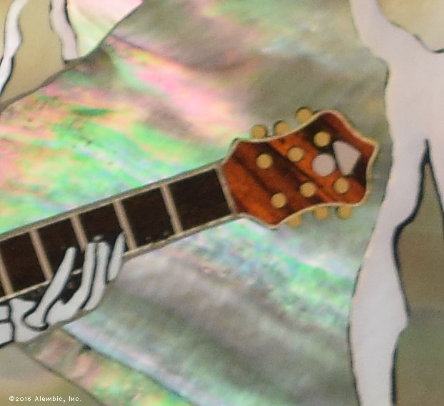 Nice little closeup of the inlaid Alembic logo in sterling silver, mother of pearl and abalone.