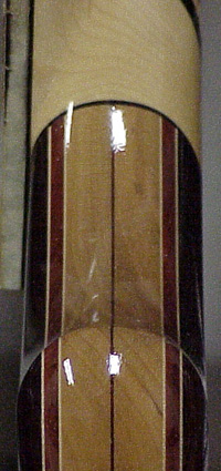 this photo. From top to back he's got: Coco Bolo, Maple, Vermilion, Maple, Cherry core with central Vermilion veneer,