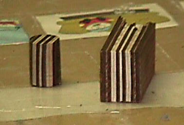 Wooden Pickup Covers and KnobsWe like to make prototypes of new challenges before we make the final product. Kris made these out of scrap maple and purpleheart to work out the details before we cut up the really good wood. The customer specified how wide to make each laminate. You can see Kris' notes for final wood choices written on the cover in pencil.